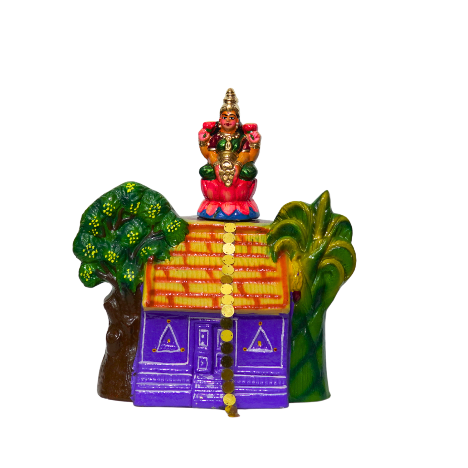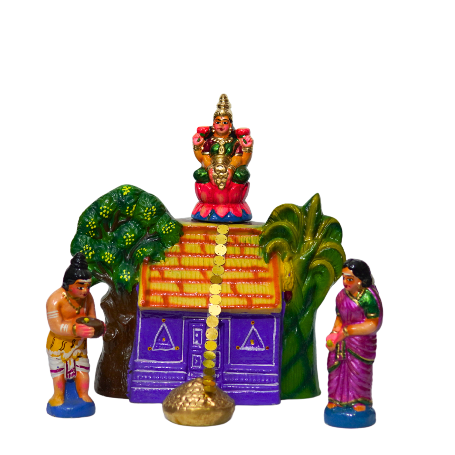 The Kanakadhara set is a beautifully handcrafted 5‑piece clay collection with a total weight of 4.200 kg, inspired by the sacred hymn composed by Adi Shankaracharya. Depicting Goddess Lakshmi and divine figures, the dolls are hand‑painted with vibrant traditional colors to symbolize prosperity, abundance, and grace. Perfect for Navaratri Golu displays, temple décor, and cultural showcases, this set embodies devotion and artistry, making it a meaningful addition to any festive or spiritual setting.