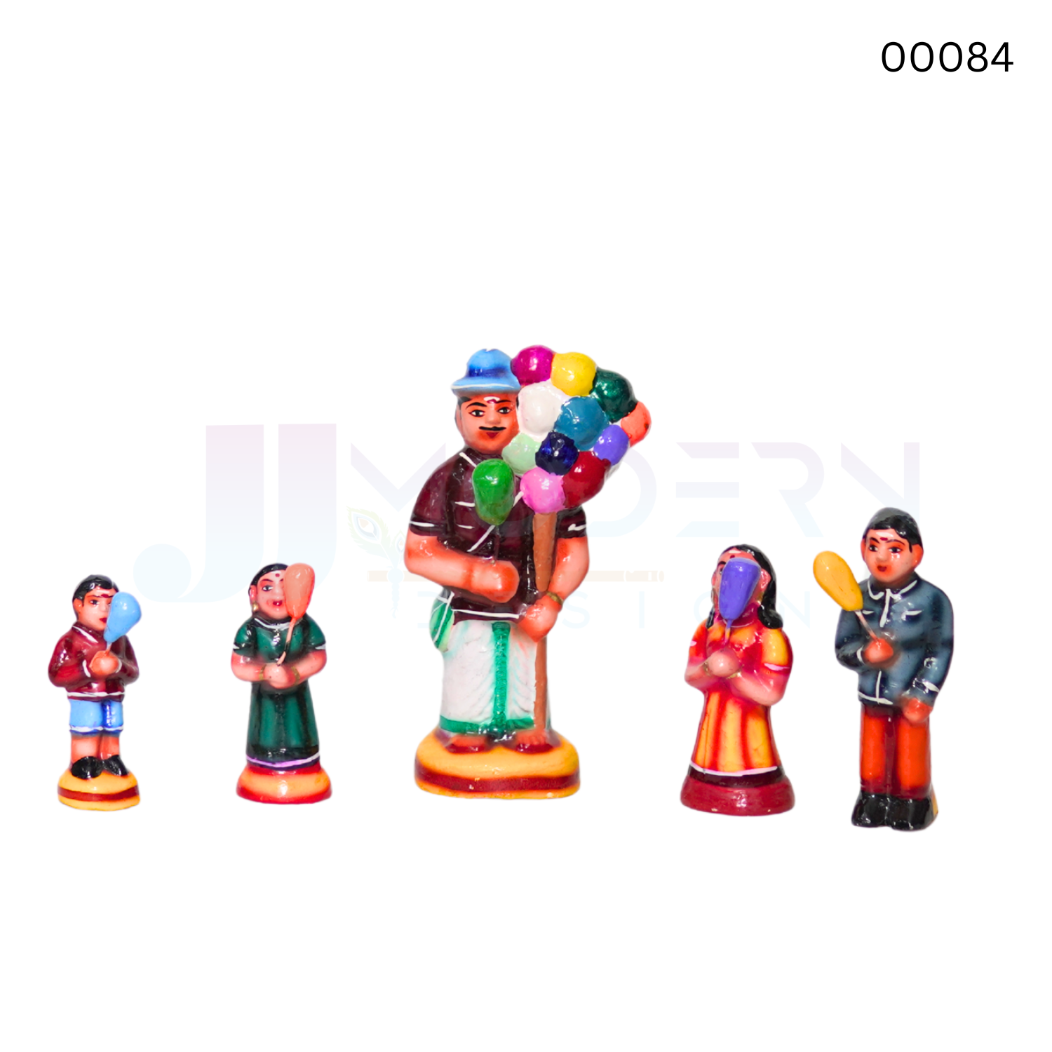 The Balloon Set is a handcrafted 7‑inch clay doll collection weighing 1.000 kg, designed to portray the festive charm of a traditional balloon vendor. Each piece is carefully sculpted from eco‑friendly clay and hand‑painted with vibrant colors, reflecting cultural authenticity and artisan skill. Perfect for Navaratri Golu displays, temple décor, and heritage showcases, the Balloon Set brings nostalgia, artistry, and joyful spirit to any devotional or cultural arrangement.
