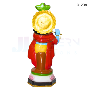 The craftsmanship of the statue is evident in the intricate carvings on Krishna’s garments, ornaments, and crown (mukut). His attire is adorned with delicate patterns that reflect traditional Indian artistry, while the jewelry adds a touch of grandeur befitting a divine figure. The crown, often highlighted with a peacock feather, symbolizes Krishna’s connection to nature and his playful, childlike spirit. The hand-painted colors bring the statue to life, with vibrant hues accentuating the richness of his attire and the divine glow of his expression. The peacock feather, painted in shades of green and blue, stands out as a symbol of beauty and grace, while the ornaments shimmer with golden tones that enhance the statue’s regal presence.